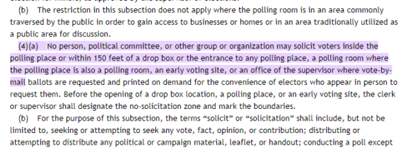 An excerpt from Florida Statute 102.031 – Maintenance of good order at polls; authorities; persons allowed in polling rooms and early voting areas; unlawful solicitation of voters.—